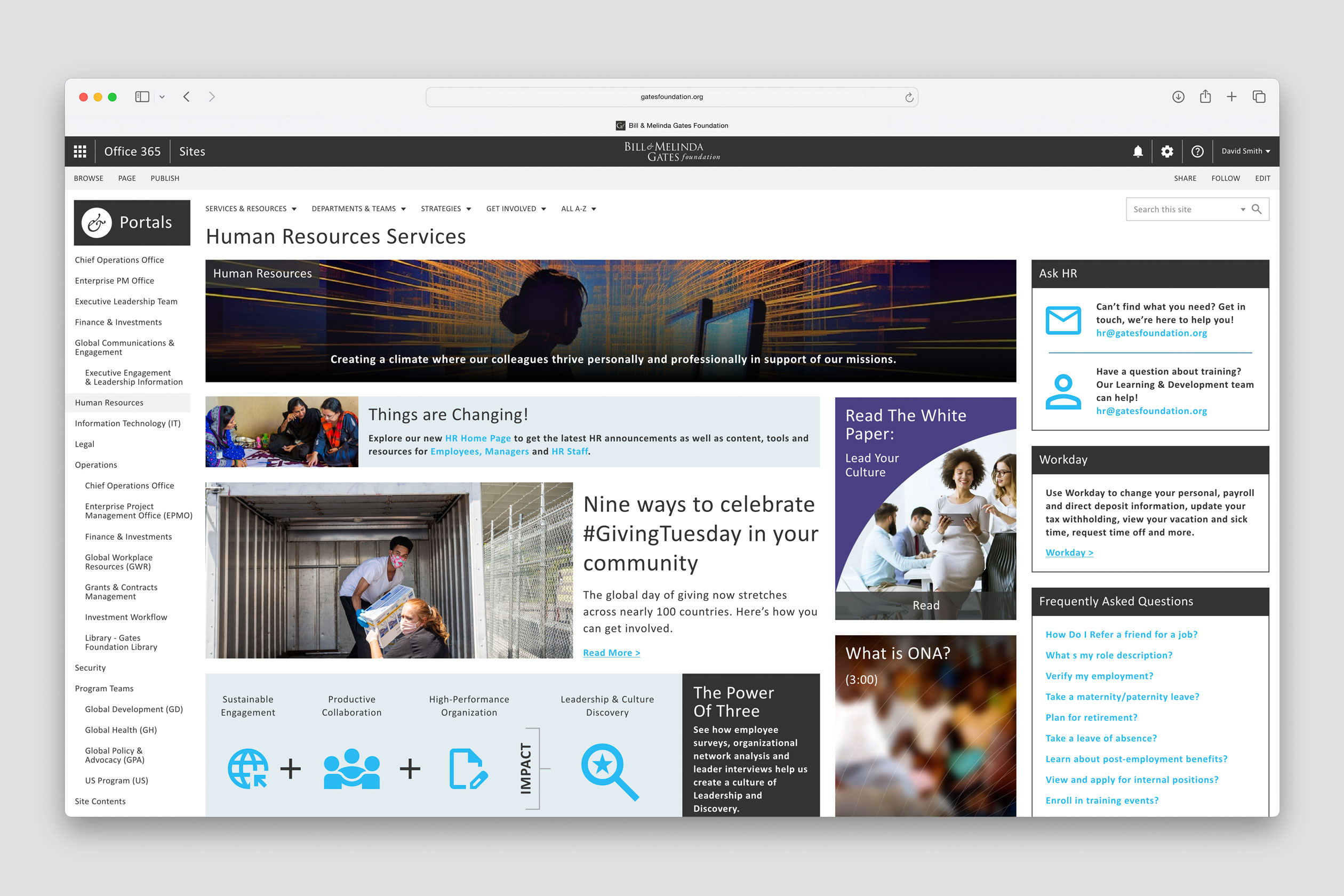 The new intranet shifted HR support from a manual, high-touch model to a seamless self-serve experience. Hundreds of staff hours previously spent fielding requests were saved, operational efficiency significantly improved, and internal engagement increased. By streamlining these processes, the Foundation freed up teams to stay focused on their mission: addressing global inequities in healthcare, agriculture, and education.